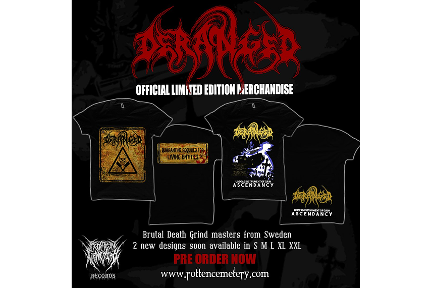 We are very honored and excited to release this 2 new official t-shirt designs from the legendary Brutal death grind masters from Sweden DERANGED! "Quarantine required for living entities" and "Undead Instrument by Grim Ascendancy" concept taken from their last album "Struck by Murderous Siege" both to be out on september 30th or before! Pre order now before it's too late!